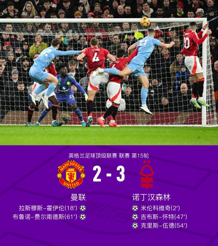 北京时间12月8日凌晨01:30,英超联赛第15轮,曼联坐镇主场老特拉福德球场,迎战诺丁汉森林。比赛开始后,诺丁汉森林便展现出强大的进攻能力,第2分钟,米伦科维奇在角球机会中头球破门,让曼联防线瞬间失守,0-1落后。曼联在此后寻求扳平,第18分钟,加纳乔射门被扑后,霍伊伦补射得手,将比分扳平为1-1。